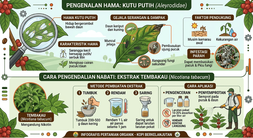 Kutu putih merupakan hama yang sering menyerang tanaman kopi dengan mengisap cairan pada daun, batang, dan buah. Serangan ditandai dengan adanya lapisan putih seperti kapas, daun menguning, serta pertumbuhan tanaman terhambat. Selain itu, kutu putih menghasilkan embun madu yang dapat memicu pertumbuhan jamur jelaga. Pengendalian dapat dilakukan melalui pemangkasan bagian terserang, menjaga sanitasi kebun, memanfaatkan musuh alami, serta penggunaan pestisida nabati atau insektisida secara tepat sesuai anjuran.